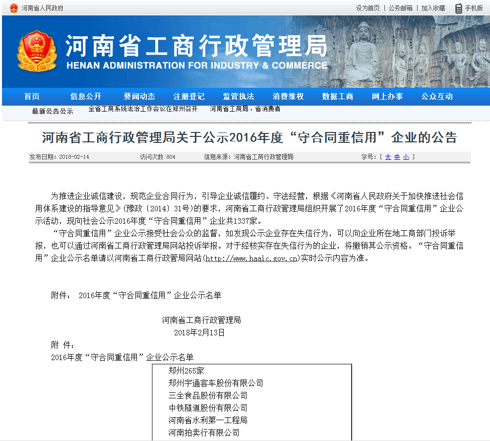 2018年2月14日,河南省工商行政管理局公布我公司被评为2016年度“守合同重信用”企业!